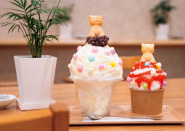 日光から、松月氷室の天然氷をお取り寄せ。自然の寒さでじっくり固めた氷は、くちどけがやさしくほんのり甘いのが特徴。かわいいくまさん最中や「おいり」をトッピングすれば、味も見た目も大満足の一杯に♪さらに店内では、老舗和菓子屋ならではの「金のどら焼き」など、こだわりの和菓子もご用意。