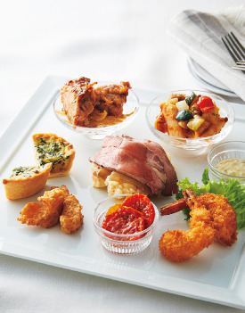 牛肉のグリル、グリルチキンや、小海老のフライ、キッシュなど、子供から大人まで大好きな食べやすい洋食メニューが勢ぞろい。