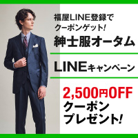 メンズフロアにて対象商品を1会計税込50,000円以上お買上げの際に、福屋公式LINEお友達登録及び画面ご提示の方、または新規お友達登録いただいた方にその場でご利用いただける「2,500円OFFクーポン」をプレゼント。〈先着200名様〉