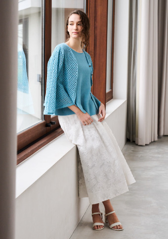 メッシュのカーディガンと立体的なAラインが美しいニットのアンサンブルは和紙混素材ならではの軽やかさが魅力です。