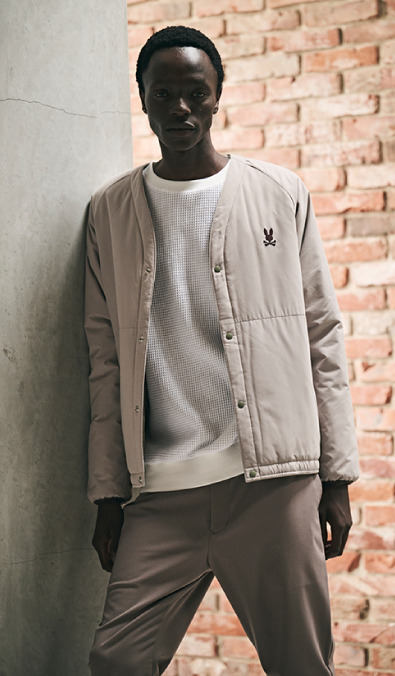 Vネックのボタンカーディガン。すっきりとした見た目がクールな印象の中綿ライトアウター。