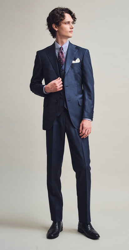 「DORMEUIL AMADEUS 365」を使用。耐久性・光沢感があり、オールシーズン着用可能スーツ。