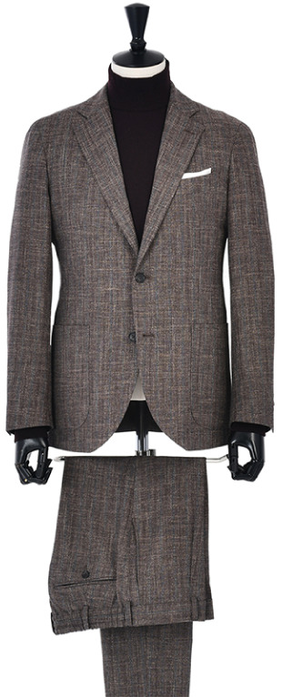 上質感のあるDORMEUIL生地を使用した今シーズンおすすめのスリーピースカラースーツ。今シーズンはモカにベージュの無地や茶色のタイを合わせるのがポイント。