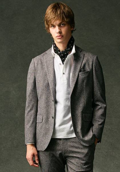 ストレッチ性抜群のジャージー素材を使用し、胸ポケットの袋布を引っ張り出すとポケットチーフになるギミックチーフを使用。洗練された大人のスタイルをご提案します。