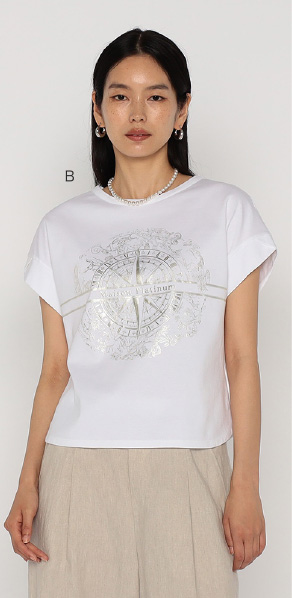 存在感のある繊細で美しい羅針盤柄オリジナル箔プリントで、ノースリーブが苦手な方にもおすすめのフレンチスリーブ。夏に快適な、さらっとした綿100%の風合いが特徴で、白でも透けにくいのが暑い時期に嬉しいポイントです。前後2WAYで着用できます。