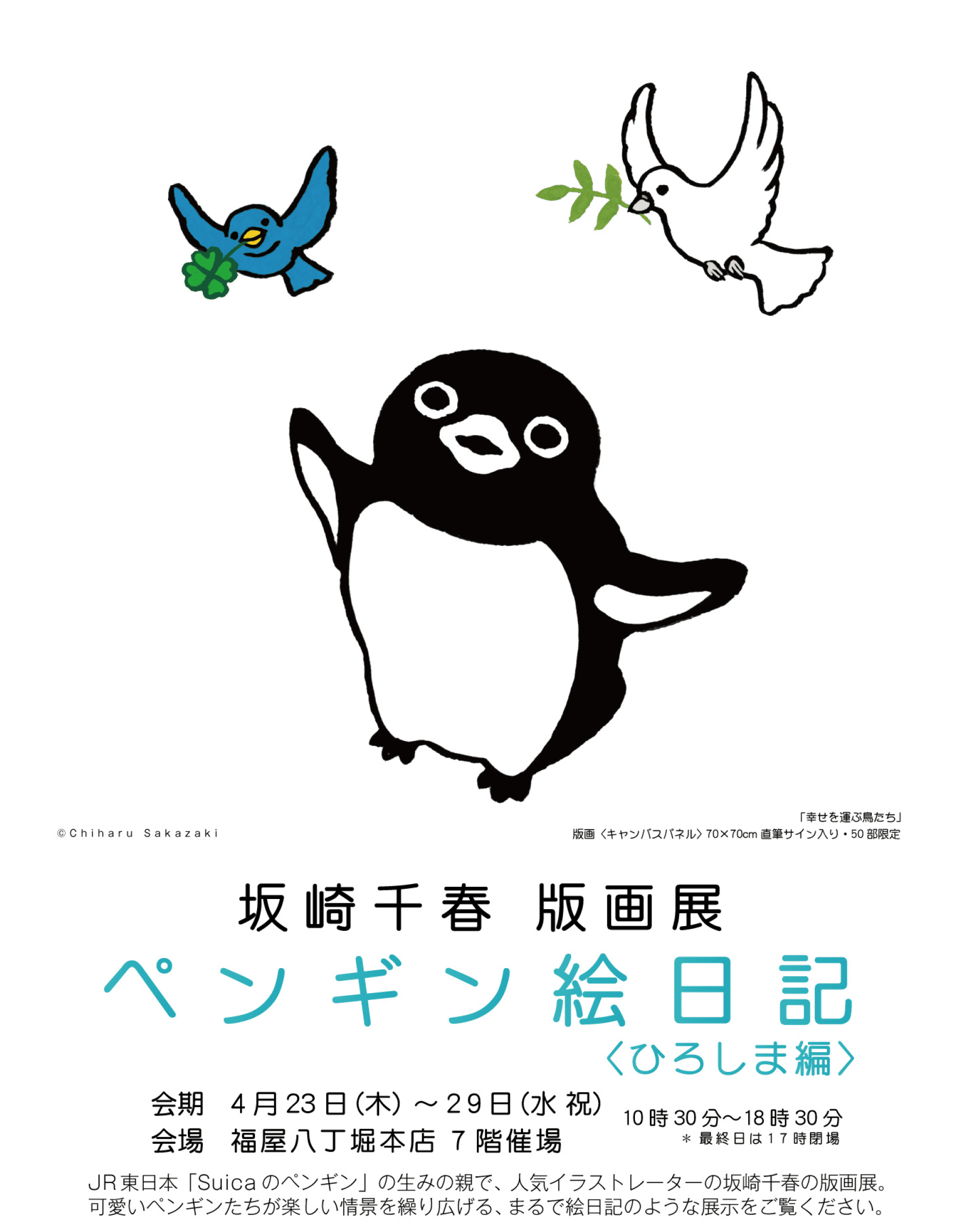 JR東日本「Suica」の生みの親で、日常の中で多くの人に親しまれている 数々のキャラクターを描く人気イラストレーター 坂崎千春さんの版画展です。 可愛いペンギンたちが繰り広げる、愛らしい世界をお楽しみください。 広島檸檬グッズも登場します。