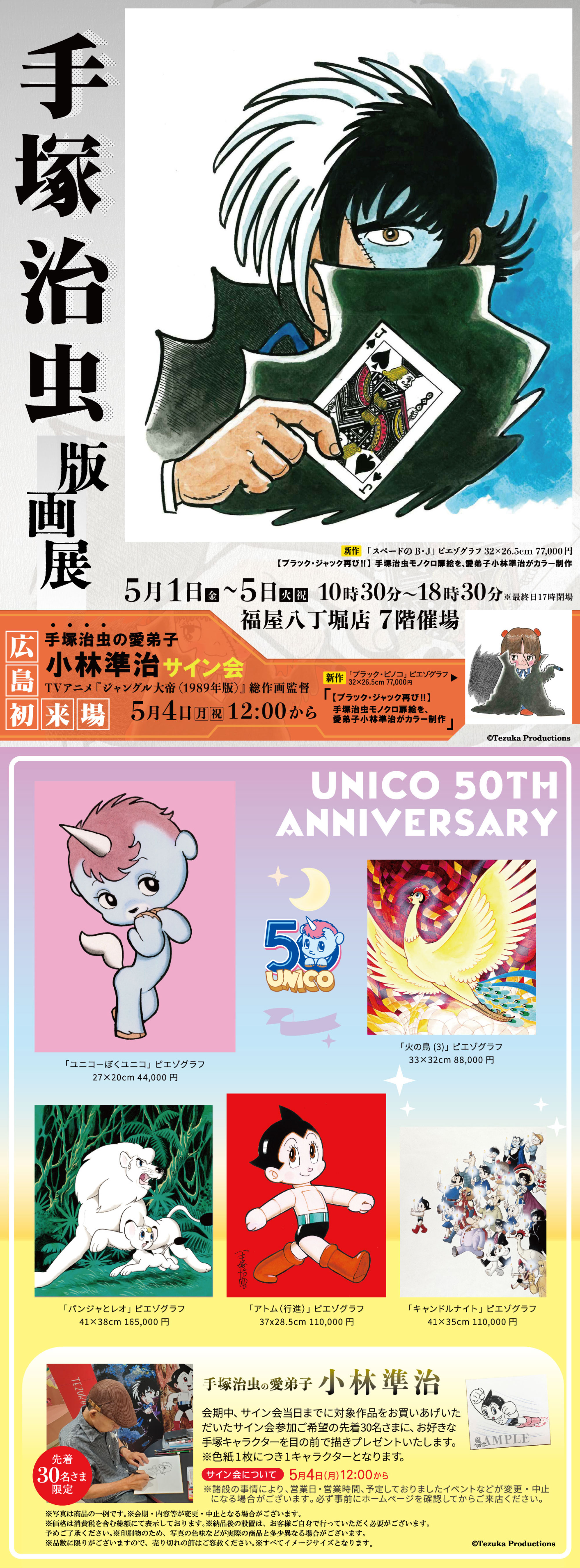 本展では、手塚治虫プロダクション監修の下に制作された 『鉄腕アトム』『ブラック・ジャック』『火の鳥』『ジャングル大帝』などの名作版画とともに、 手塚治虫モノクロ扉絵を、愛弟子の小林準治がカラー制作した 『ブラック・ジャック』の新作版画も展示販売いたします。どうぞご来場ください。