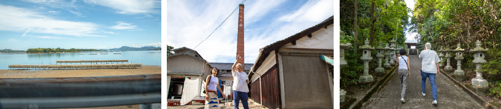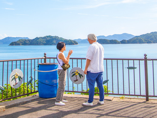 今田美穂さんがまず案内してくださったのは、そんな瀬戸内海を見渡す大芝島。インスタ映えスポットとして近年人気の場所です。島と本土をつなぐ大芝大橋上で涼風をいただきながら説明に聞き入る辻󠄀口シェフ。青い空と青い海、いくつもの島影を借景にして話が尽きないお二人の姿は、まるで一葉の絵画のようです。