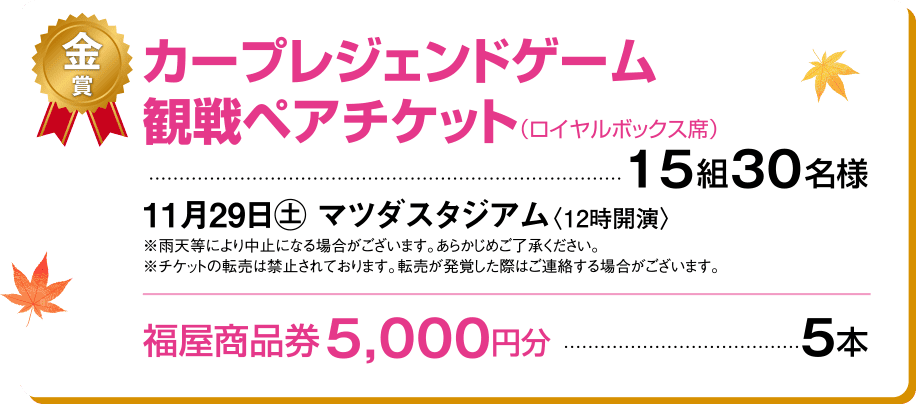 期間中、対象売場で1会計税込2,000円以上お買上げいただき、お買上げのレシートを抽選会場までお持ちいただくと、カープレジェンドゲームの観戦チケットや福屋商品券などが当たるガラポン抽選会にご参加できます。