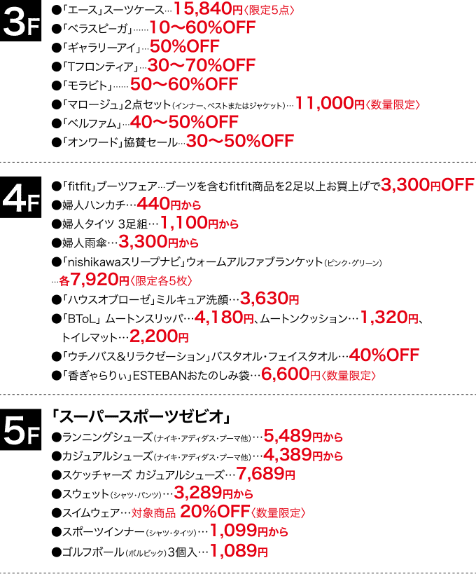 広島駅前店3階の改装にともない、売りつくしセールを開催! 有名ブランドのレディスファッションがプライスOFFになるのをはじめ、 暮らしのアイテムや「スーパースポーツゼビオ」のシューズなどが、 特別プライスで登場。どうぞお見逃しなく!