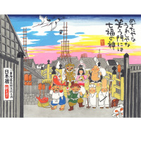 日本の伝統的な題材を現代感覚で再構築する「水墨ポップアート」の世界を描き続ける岡本氏。七福神をはじめ、招き猫や達磨などの招福の存在をユーモアと温かみある筆致で表現しています。日本の名所や宿場町など、街道沿いの風景や風物を描いた作品群は江戸の時代に流行しました。