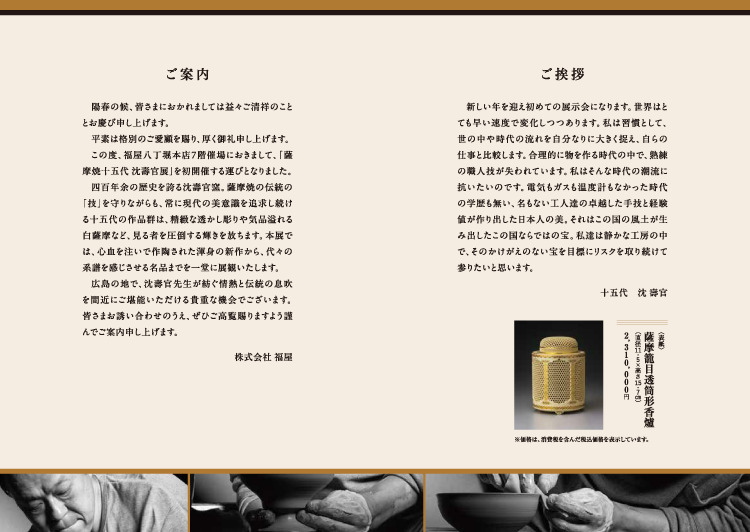 十五代の作品を揃えて「薩摩焼 十五代 沈壽官展」を開催いたします。