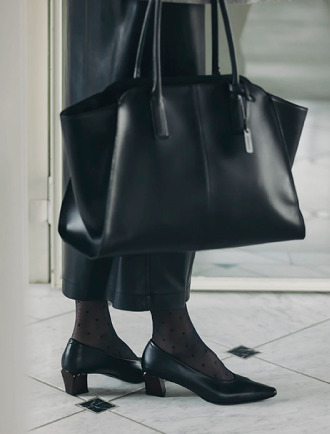 深めの履き口とスクウエアトウでほんのりモードにアップデート。ブロックヒールにべっこう柄をあしらって、さりげなくアイキャッチ。