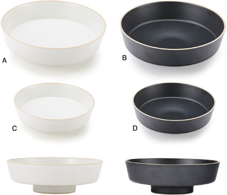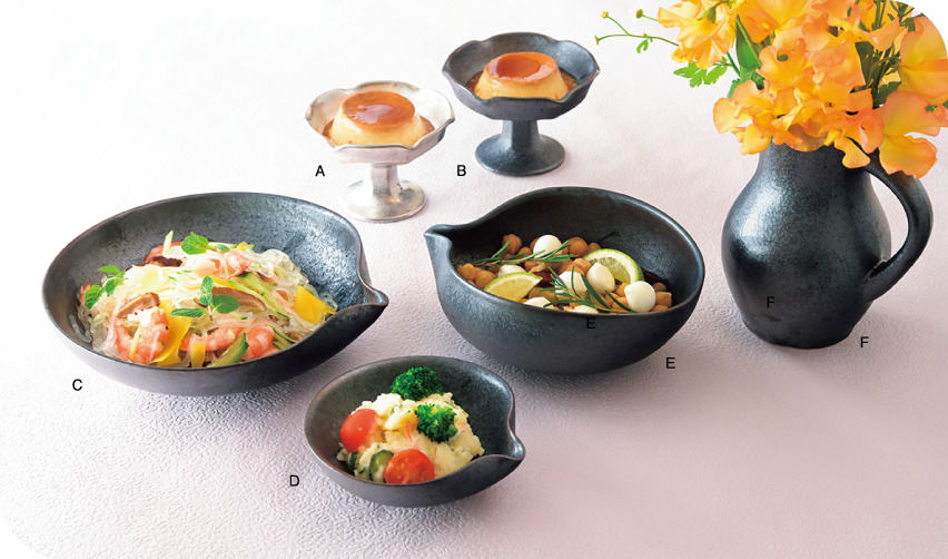(A)銀塗 高台デザートM 2,860円 (B)ショウ 高台デザートL 2,750円 (C)ショウ 片口浅鉢20cm 6,600円