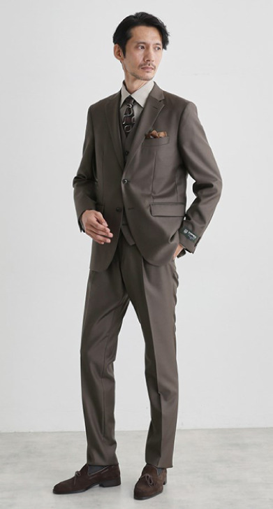 上質感のあるDORMEUIL生地を使用した今シーズンおすすめのスリーピースカラースーツ。今シーズンはモカにベージュの無地や茶色のタイを合わせるのがポイント。