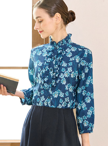 人気のスタンドフリルに筆書きのフラワープリントを復刻したデザイン。透け感が少なく微光沢で上品なブラウスです。