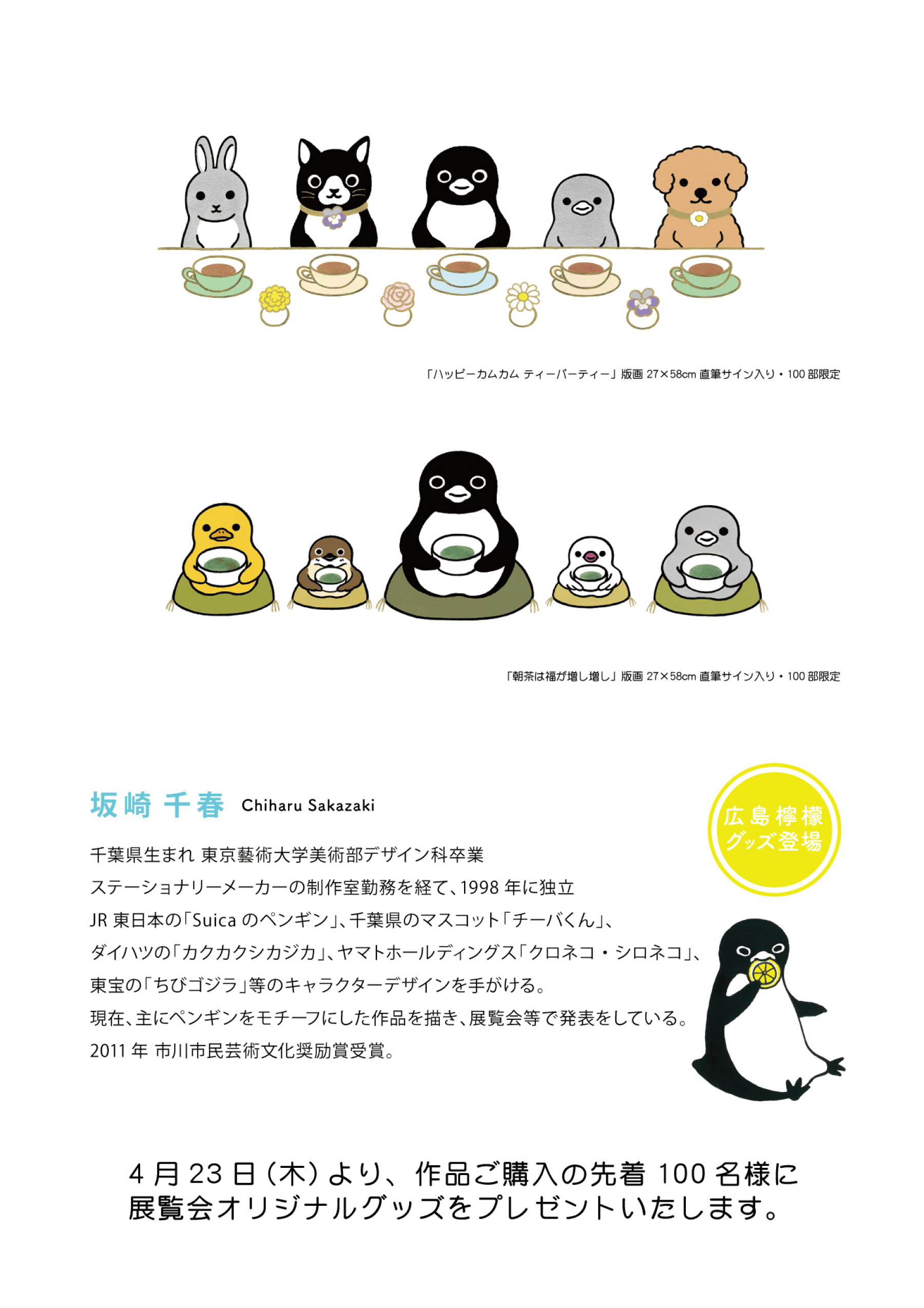 JR東日本「Suica」の生みの親で、日常の中で多くの人に親しまれている 数々のキャラクターを描く人気イラストレーター 坂崎千春さんの版画展です。 可愛いペンギンたちが繰り広げる、愛らしい世界をお楽しみください。 広島檸檬グッズも登場します。